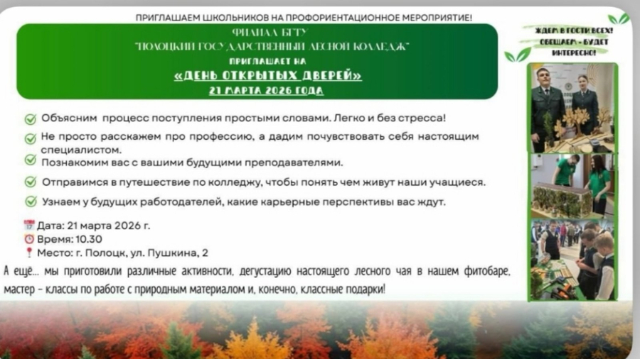 21 марта Полоцкий государственный лесной колледж открывает двери для будущих студентов.